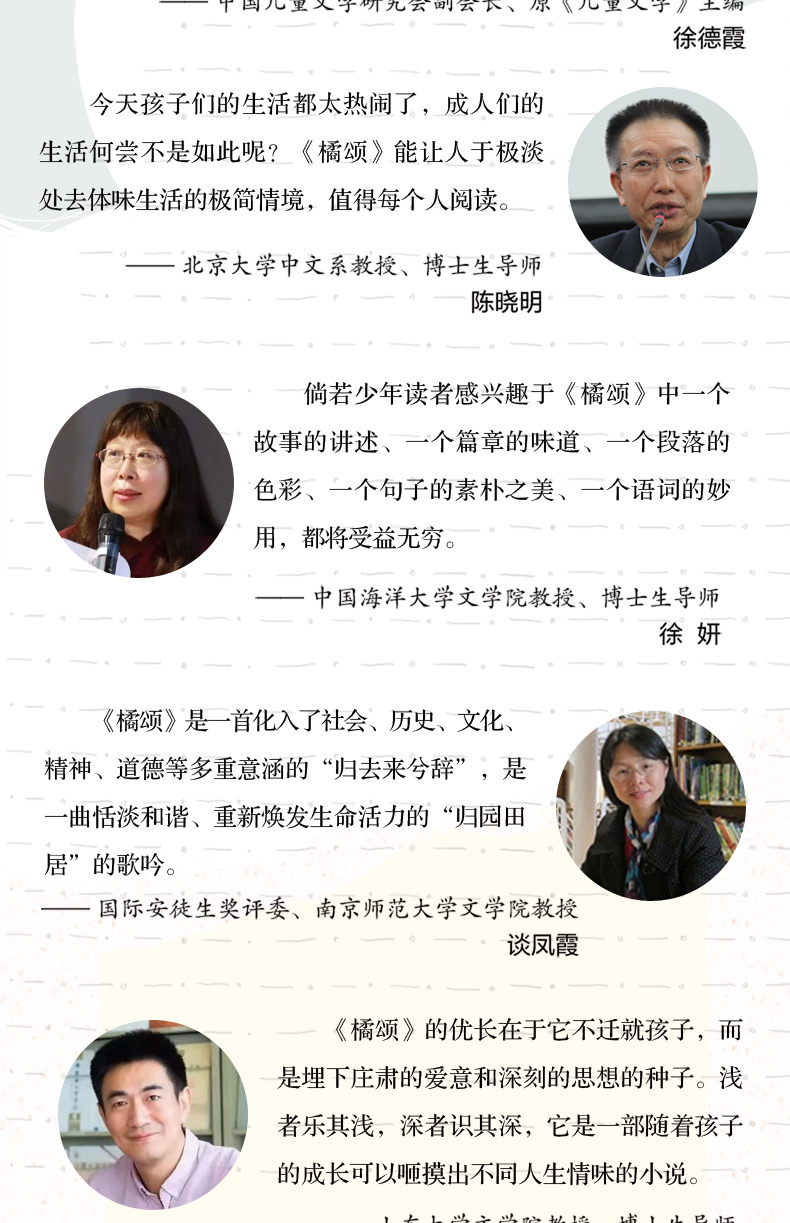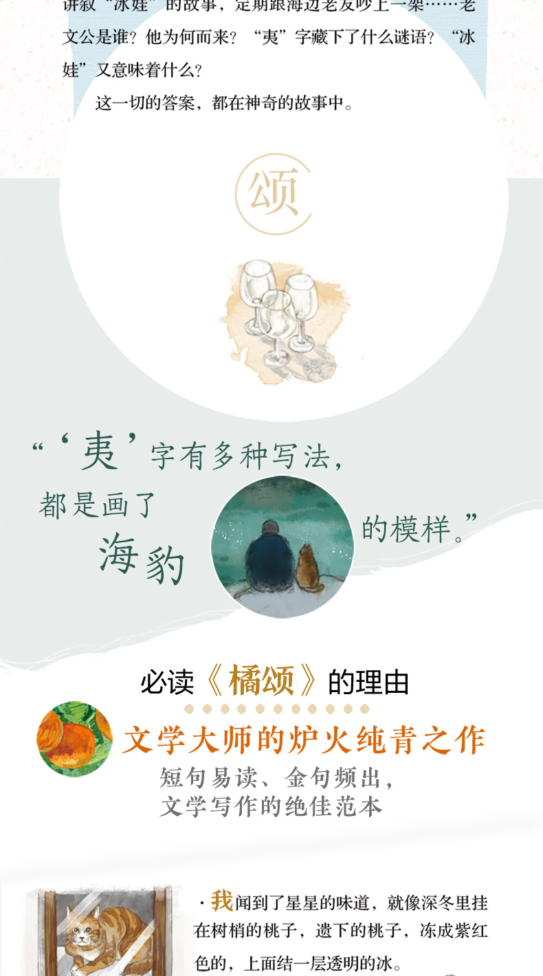 本書(shū)借助老文公對家族曆史的追問、對荒蕪石村(cūn)的探尋、對瀕危海洋“冰娃”故事的解密、對“橘頌”美好隐喻的演繹,把山村(cūn)與海洋、曆史與現實、堅守與遺棄、自然與人文等巧妙勾連起來。塑造了以老文公為代表的忠于理想、堅守正義的知(zhī)識分(fēn)子形象,書(shū)寫了四代國人一(yī)脈相承的精神氣質,表達出作者對新一(yī)代少年的殷殷期盼和對人類生(shēng)存處境的深層憂慮,以及融入大(dà)地、回歸自然、關切人性的理想訴求。