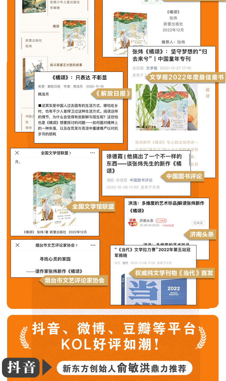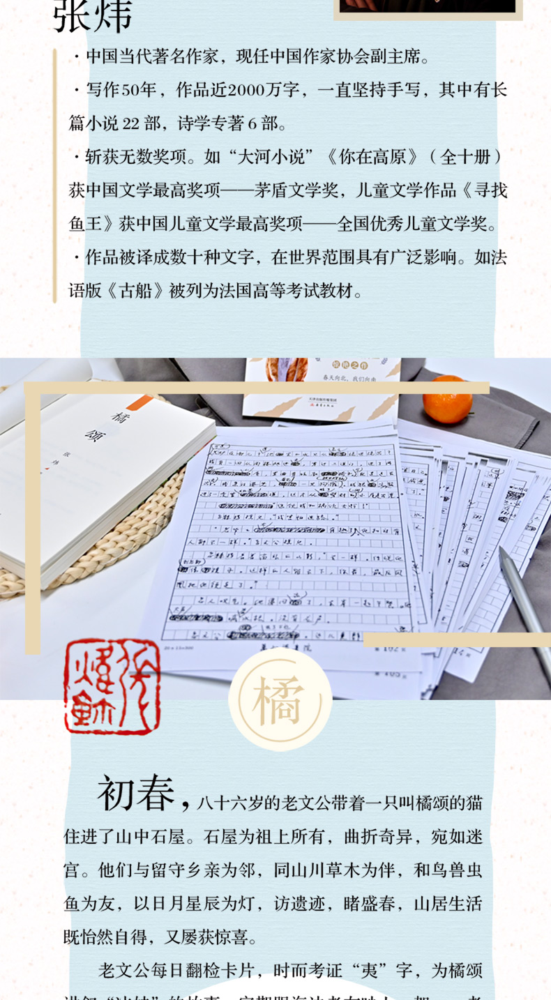 《橘頌》以不疾不徐的節奏、平和曠達的筆調,娓娓講述了一(yī)位老人和一(yī)隻貓在一(yī)個春天裡的山居生(shēng)活。他們住進迷宮般的石屋,與留守鄉親為鄰,同山川草木為伴,和鳥獸蟲魚為友,以日月星辰為燈,訪遺迹,睹盛春,山居生(shēng)活既怡然自得,又(yòu)屢獲驚喜。